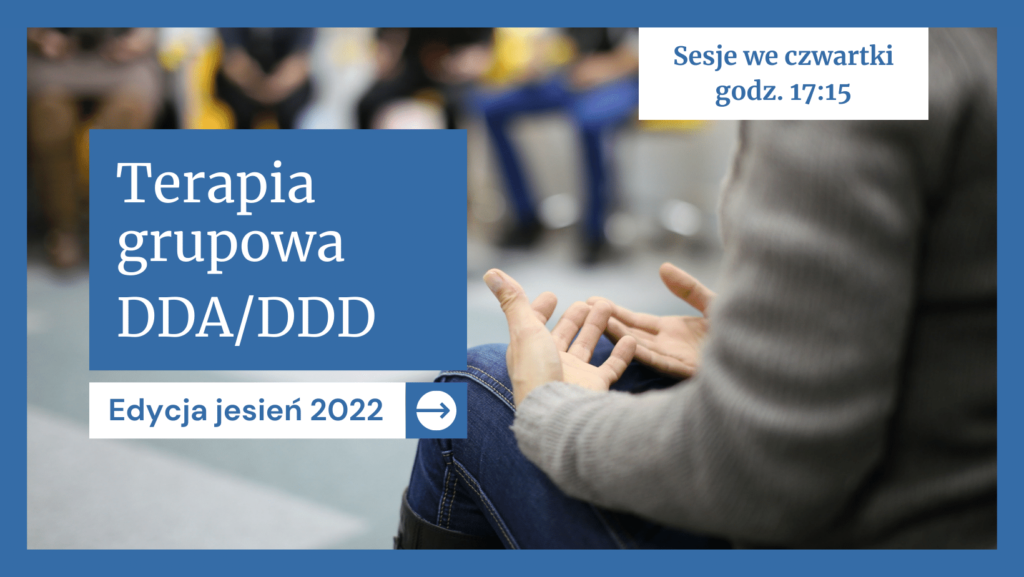 Grupa terapeutyczna osób DDA/DDD rozpocznie spotkania dnia 16 marca 2022 roku. Program terapii realizowany jest w trakcie 10 miesięcy. Sesje będą odbywały się we środy, w godzinach 17:15-19:00. Ilość osób w grupie do 12.
