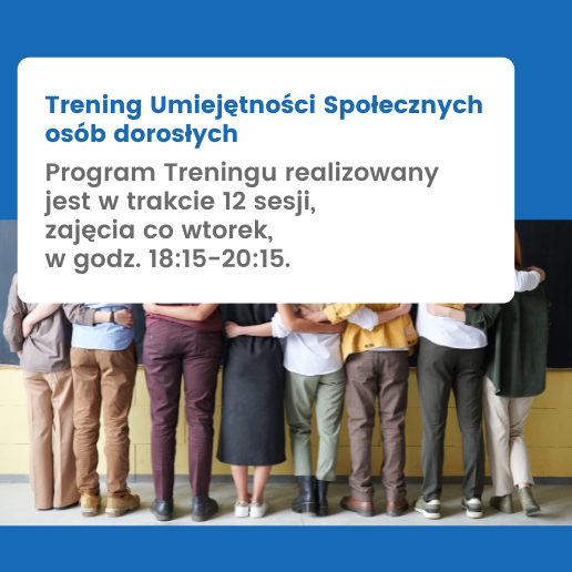 Trening Umiejętności Społecznych realizowany jest w trakcie 12 sesji grupowych (grupa do 12 osób).